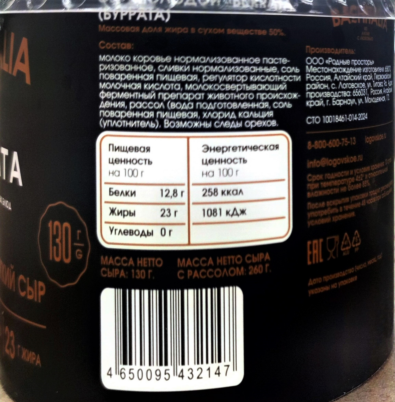Молоко коровье нормализированное пастеризованное, сливки нормализованные, соль поваренная пищевая, регулятор кислотности молочная кислота, молокосвертывающий ферментный препарат животного происхождения, рассол (вода подготовленная, соль поваренная пищевая, хлорид кальция (уплотнитель).