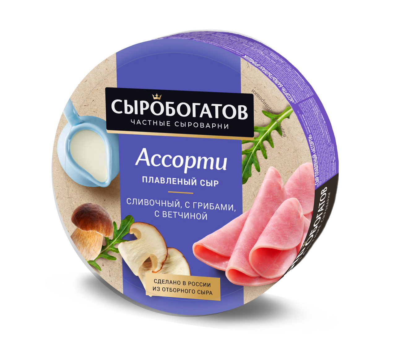 Сыр нормализованное пастеризованное молоко, пищевая соль, уплотнитель хлорид кальция, молокосвертывающий ферментный препарат микробного происхождения, закваска мезофильных и термофильных молочнокислых микроорганизмов, краситель Аннато, ферментный препарат животного происхождения Лизоцим из белка куриных яиц, вода питьевая, масло сливочное, сухое обезжиренное молоко, сыворотка молочная сухая, крахмал кукурузный, комплексная пищевая добавка эмульгаторы Е450 и Е339, регуляторы кислотности Е451 и Е450, стабилизатор Е339, молочный белок, загуститель Е1422, загуститель Е407а, только для сыра сливочного - ароматизатор мальтодекстрин, крахмал модифицированный из восковой кукурузы Е1450, ароматизатор, сахар, антислеживающий агент диоксид кремния Е551, вкусоароматические вещества, только для сыра с грибами - грибы сушеные шампиньоны, ароматизатор Грибы, декстроза, усилитель вкуса и аромата Е621, соль, только для сыра с ветчиной - ветчина свинина, вода, крахмал картофельный, соль, сахар, пшеничные пищевые волокна, регуляторы кислотности Е451, ацетат натрия и цитрат натрия, стабилизатор Е450, антиокислитель изоаскорбат натрия, нитритно-посолочная смесь соль, фиксатор окраски - нитрит натрия, ароматизатор, натуральные вкусо-ароматические вещества, ароматические препараты, декстроза, соль, соль пищевая, консервант сорбат калия, регулятор кислотности. Возможно наличие следов сои, яичного белка, орехов, глютена, горчицы, сельдерея. Противопоказано при индивидуальной непереносимости молочного белка и лактозы.