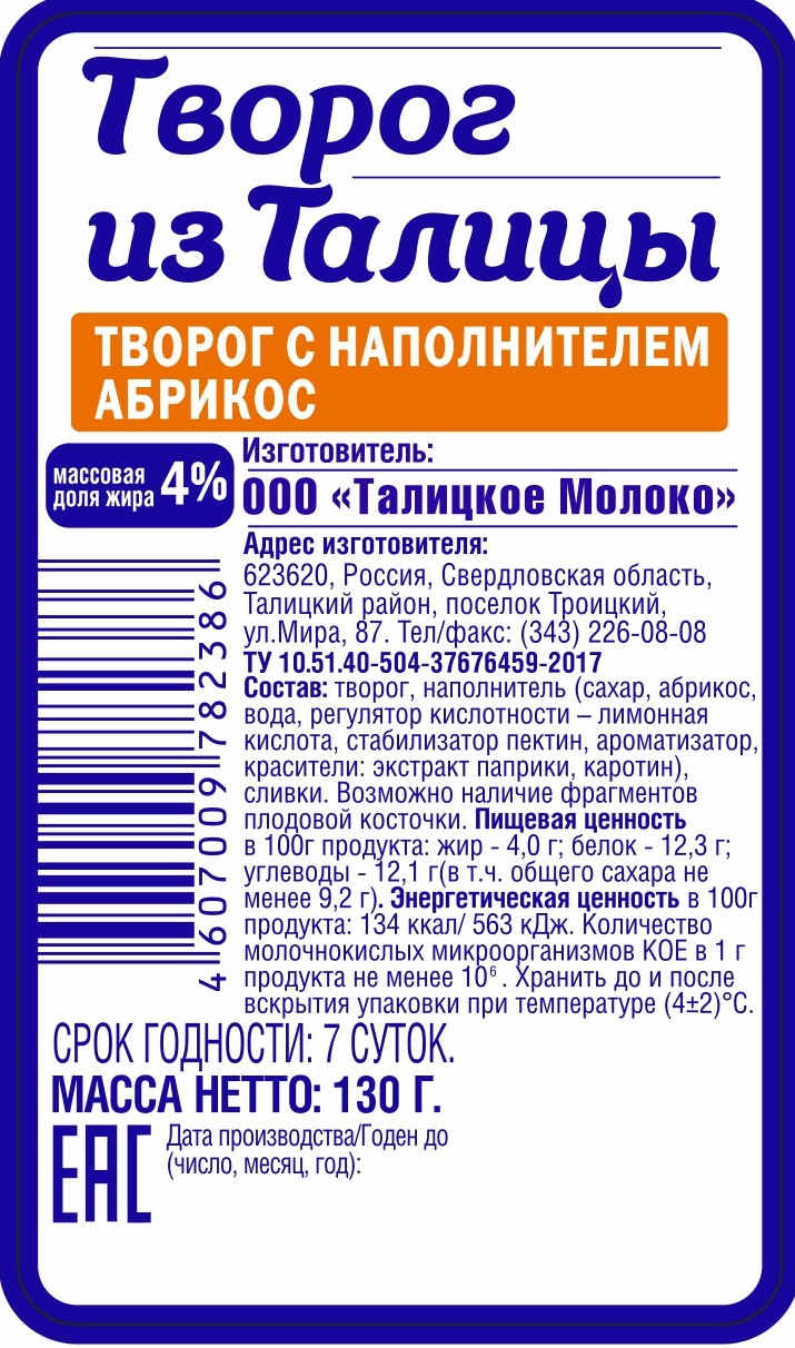 Творог Из Талицы с вареньем абрикос 4%, 130г