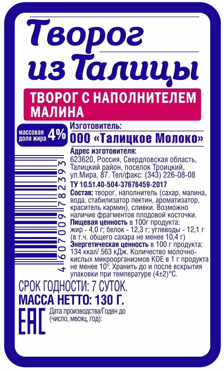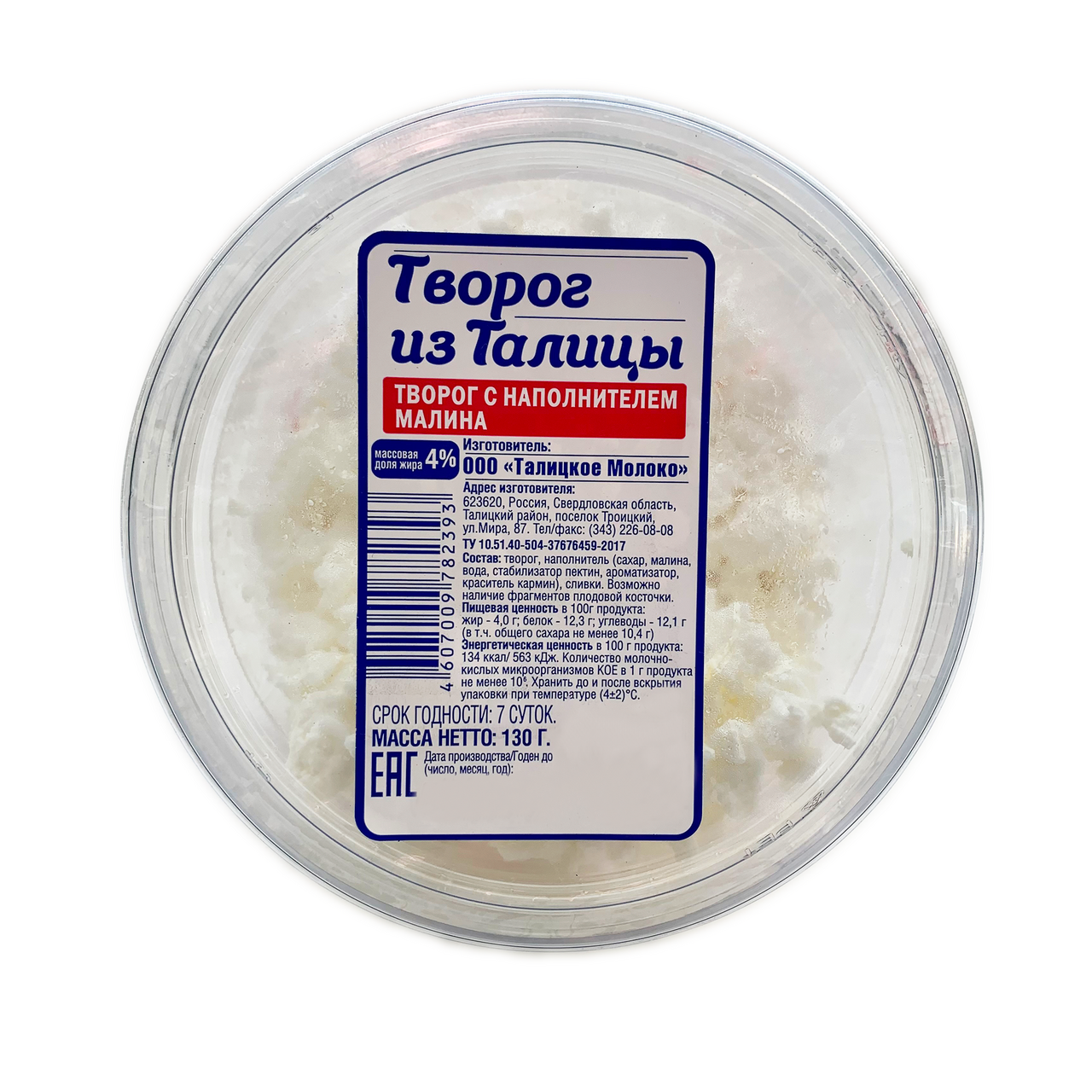 Творог Из Талицы с вареньем малина 4%, 130 г обязательно понравится детям и взрослым. Представляет собой идеальное сбалансированное сочетание натурального творога с фруктовым наполнителем. Вкус густой, обволакивающий, текстура бархатистая. За счет герметичной упаковки, которая легко открывается, творожок можно брать с собой в качестве полезного перекуса на работу или на прогулку. Легко усваивается, в нем содержится много полезных микроорганизмов, белка и мало жира. Что удивительно, творог позволяет улучшить настроение, снять волнение и устранить последствия стресса. За счет содержания большого количества кальция при регулярном употреблении творожка укрепляется костная ткань, предотвращается возникновение артрита и кариеса. А благодаря ��рактичной индивидуальной упаковке продукт удобно взять с собой в офис и в дорогу. Лакомство понравится не только взрослым, но и детям.