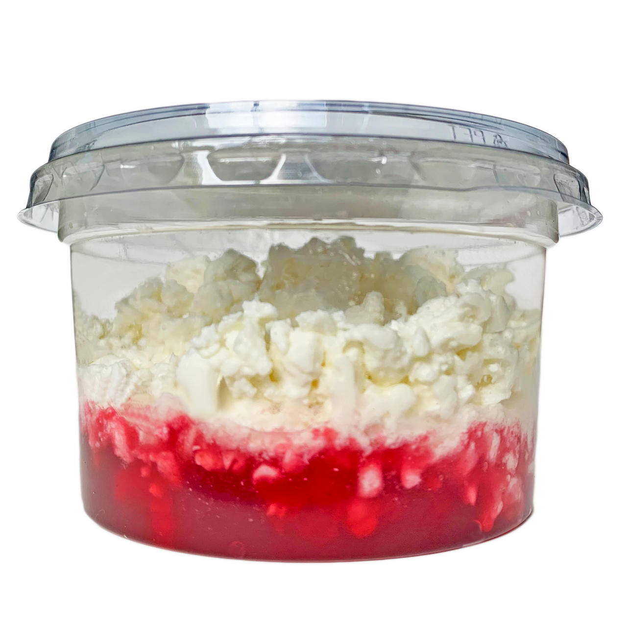 Обезжиренное молоко с использованием закваски, варенье (сахар, малина, вода, стабилизатор - пектин, ароматизатор натуральный, краситель: кармин).