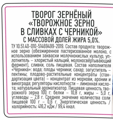 Творожное зерно (обезжиренное пастеризованное молоко, с использованием закваски молочнокислых культур, уплотнитель - хлористый кальций, молокосвёртывающий фермент), сливки, соль пищевая. Состав наполнителя Черника: вода; плоды черники; сахар; загуститель – пектины; плодово-растительные концентраты (стандартизация цвета) – концентрат из моркови, аронии и винограда; регуляторы кислотности – лимонная кислота; натуральный ароматизатор.
