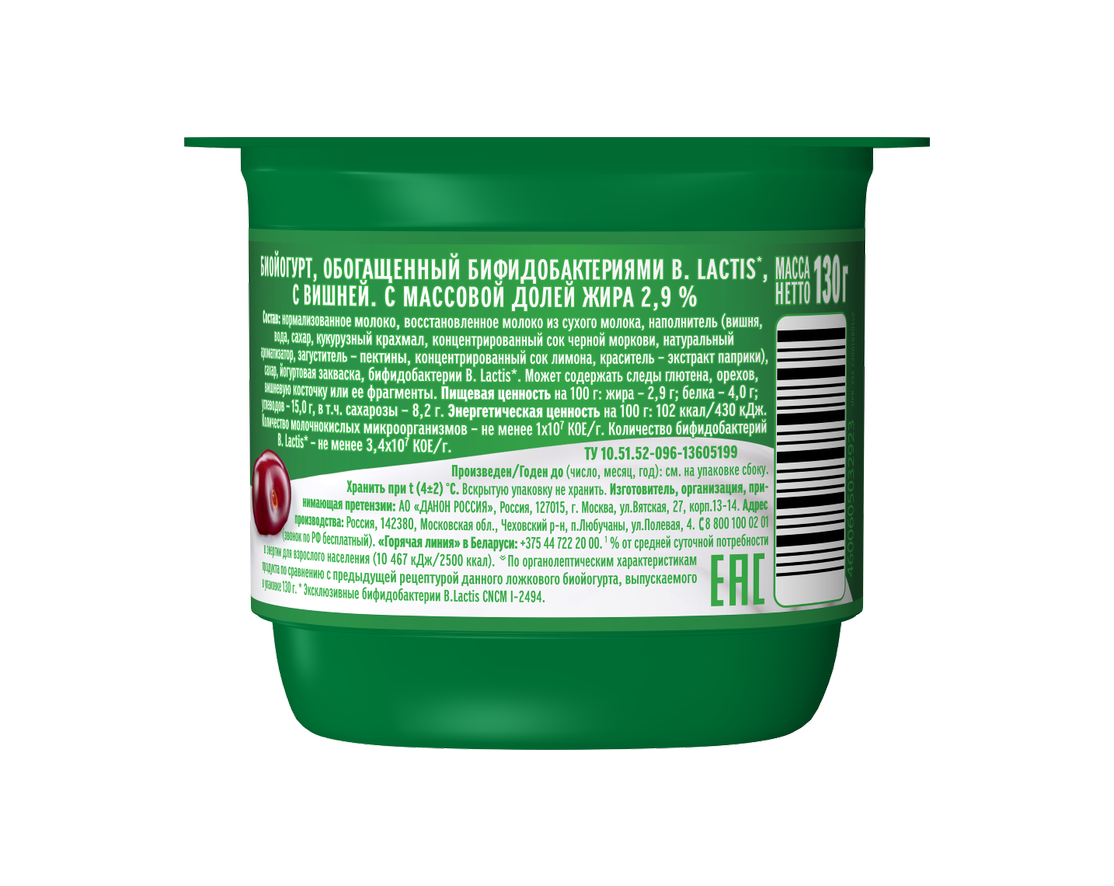 Нормализованное молоко, восстановленное молоко из сухого молока, наполнитель (вишня, сахар, вода, кукурузный крахмал, концентрированный сок черной моркови, натуральный ароматизатор, загуститель – пектины, концентрированный сок лимона, краситель – экстракт паприки), сахар, йогуртовая закваска, бифидобактерии B. Lactis*. Может содержать следы глютена, орехов, вишневую косточку или ее фрагменты. Количество молочнокислых микроорганизмов – не менее 1х107 КОЕ/г. Количество бифидобактерий B. Lactis* – не менее 3,4х107 КОЕ/г.