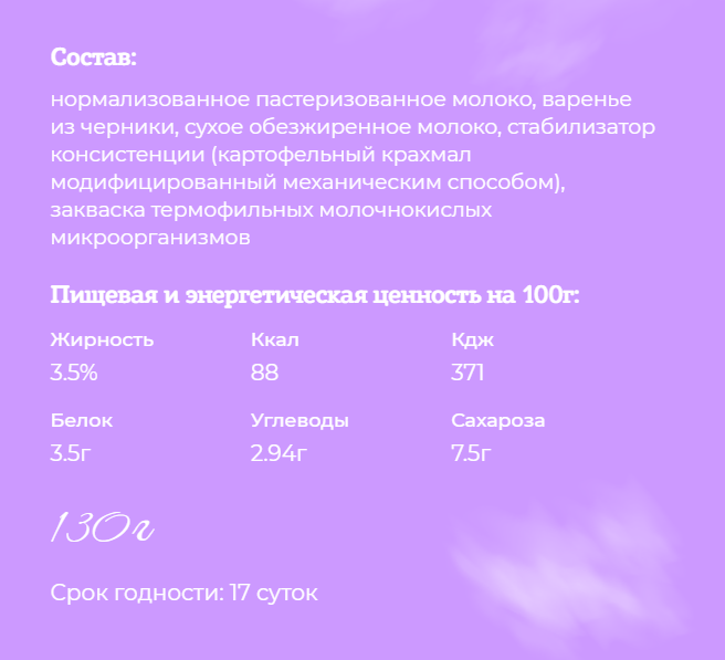 Нормализованное пастеризованное молоко, варенье из черники, сухое обезжиренное молоко, стабилизатор консистенции (картофельный крахмал модифицированный механическим способом), закваска термофильных молочнокислых микроорганизмов.