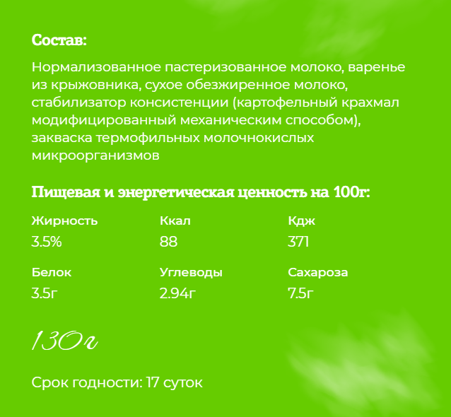 Нормализованное пастеризованное молоко, варенье из крыжовника, сухое обезжиренное молоко, стабилизатор консистенции (картофельный крахмал модифицированный механическим способом), закваска термофильных молочнокислых микроорганизмов.