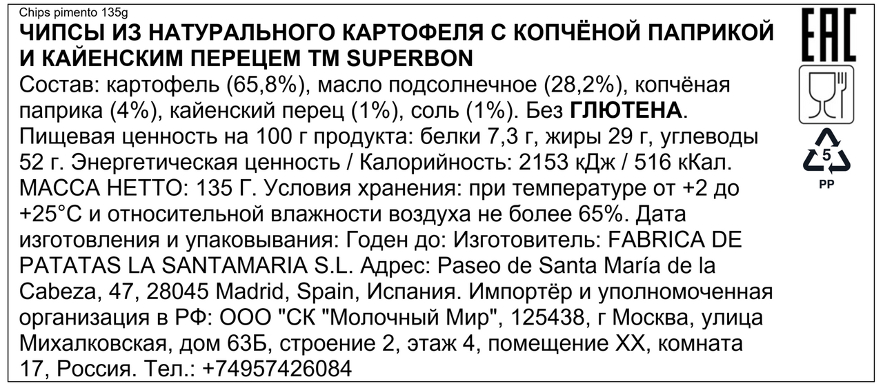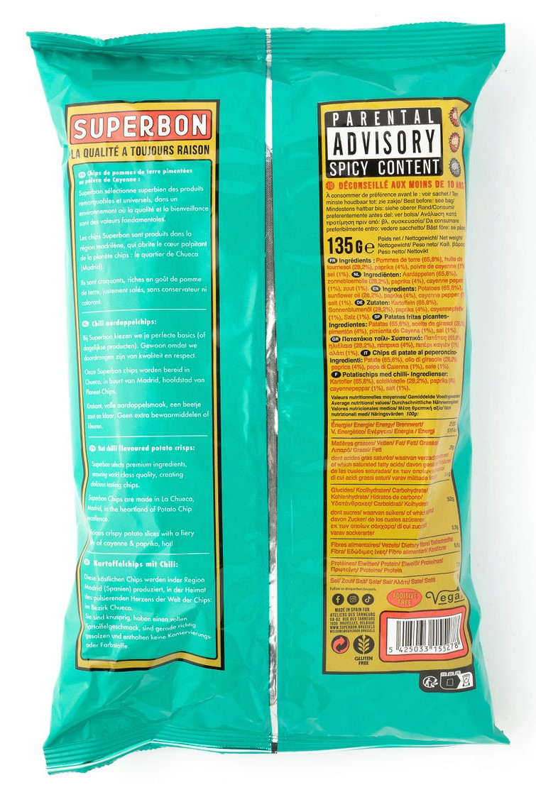 Произведенные в Испании, чипсы Superbon отражают средиземноморские традиции качества и вкуса, используя только высококачественный картофель и лучшие специи. Благодаря идеальной обжарке, каждый чипс имеет золотистую хрустящую текстуру, которая делает употребление этих чипсов истинным наслаждением.