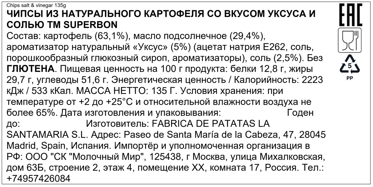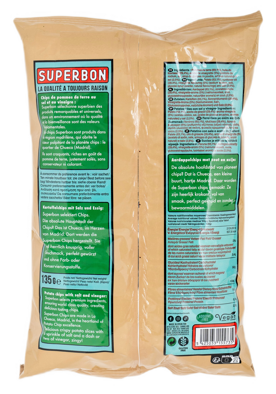 Произведенные в Испании, чипсы Superbon отражают средиземноморские традиции качества и вкуса, используя только высококачественный картофель и лучшие специи. Благодаря идеальной обжарке, каждый чипс имеет золотистую хрустящую текстуру, которая делает употребление этих чипсов истинным наслаждением.