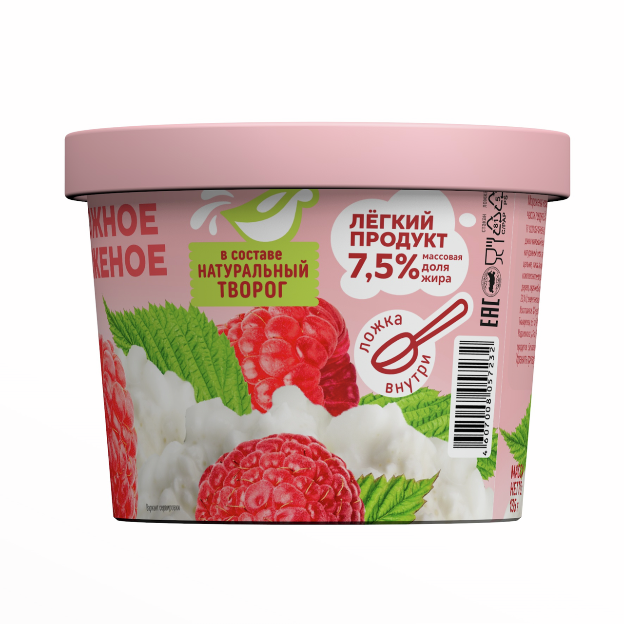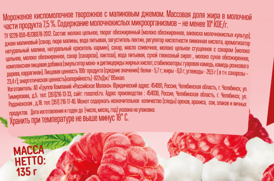 Молоко цельное, творог обезжиренный (молоко обезжиренное, закваска молочнокислых культур), джем малиновый (сахар, пюре малины, вода питьевая, загуститель пектин, регулятор кислотности лимонная кислота, ароматизатор натуральный малина, натуральный краситель кармин), сахар, масло сливочное, молоко цельное сгущенное с сахаром (молоко цельное, молоко обезжиренное, сахар (сахароза), лактоза), вода питьевая, сухой глюкозный сироп, молоко сухое обезжиренное, комплексная пищевая добавка (эмульгатор моно- и диглицериды жирных кислот, стабилизаторы: гуаровая камедь, камедь рожкового дерева, каррагинан).