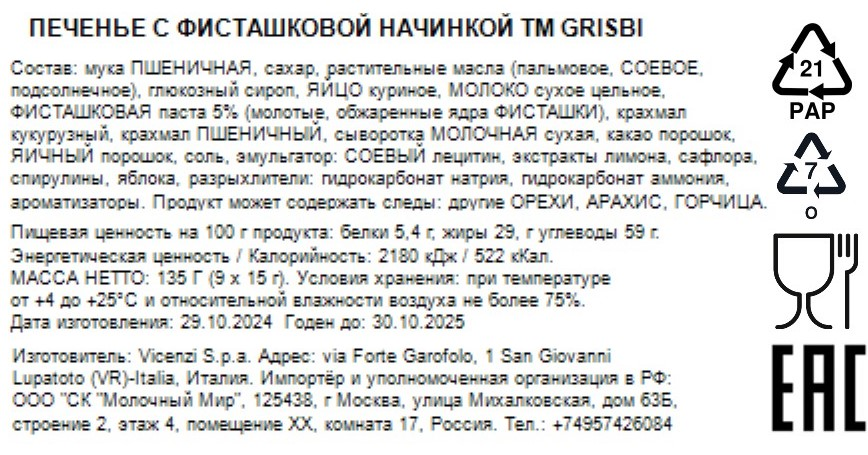 Пшеничная мука, сахар, растительные масла (пальмовое, соевое, подсолнечное), глюкозный сироп, куриное яйцо, сухое цельное молоко, фисташковая паста (молотые, обжаренные ядра фисташки), крахмал кукурузный, пшеничный крахмал, сухая молочная сыворотка, какао порошок, яичный порошок, соль, эмульгатор: соевый лецитин, экстракты лимона, сафлора, спирулины, яблока, разрыхлители: гидрокарбонат натрия, гидрокарбонат аммония, ароматизаторы.
