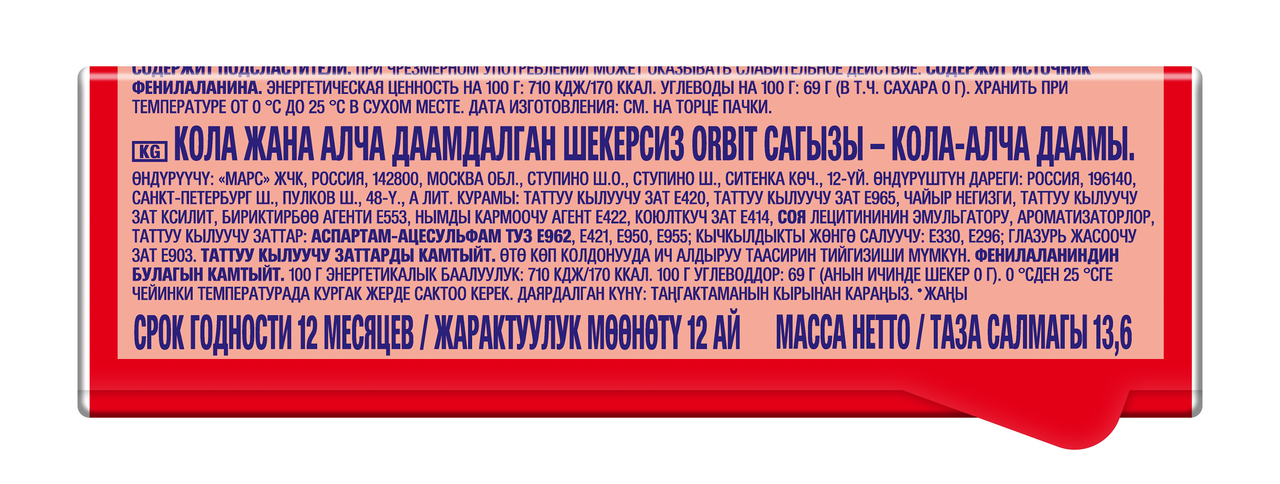 Жевательная резинка Orbit Кола-вишня, 13,6г - это освежающая жевательная резинка без сахара с оригинальным вкусом классической колы и сочной вишни. Благодаря специальной формуле она помогает поддерживать здоровье полости рта: удаляет остатки пищи, способствует уменьшению зубного налёта, нейтрализует вредные кислоты и усиливает процесс реминерализации эмали. Orbit не прилипает к зубам, долго сохраняет насыщенный вкус и освежает дыхание. В каждой упаковке 10 подушечек. Жуй Orbit, когда нужно сконцентрироваться, собраться с мыслями или просто выдохнуть. Удобный формат делает её идеальной для учебы, работы или в дороге.
