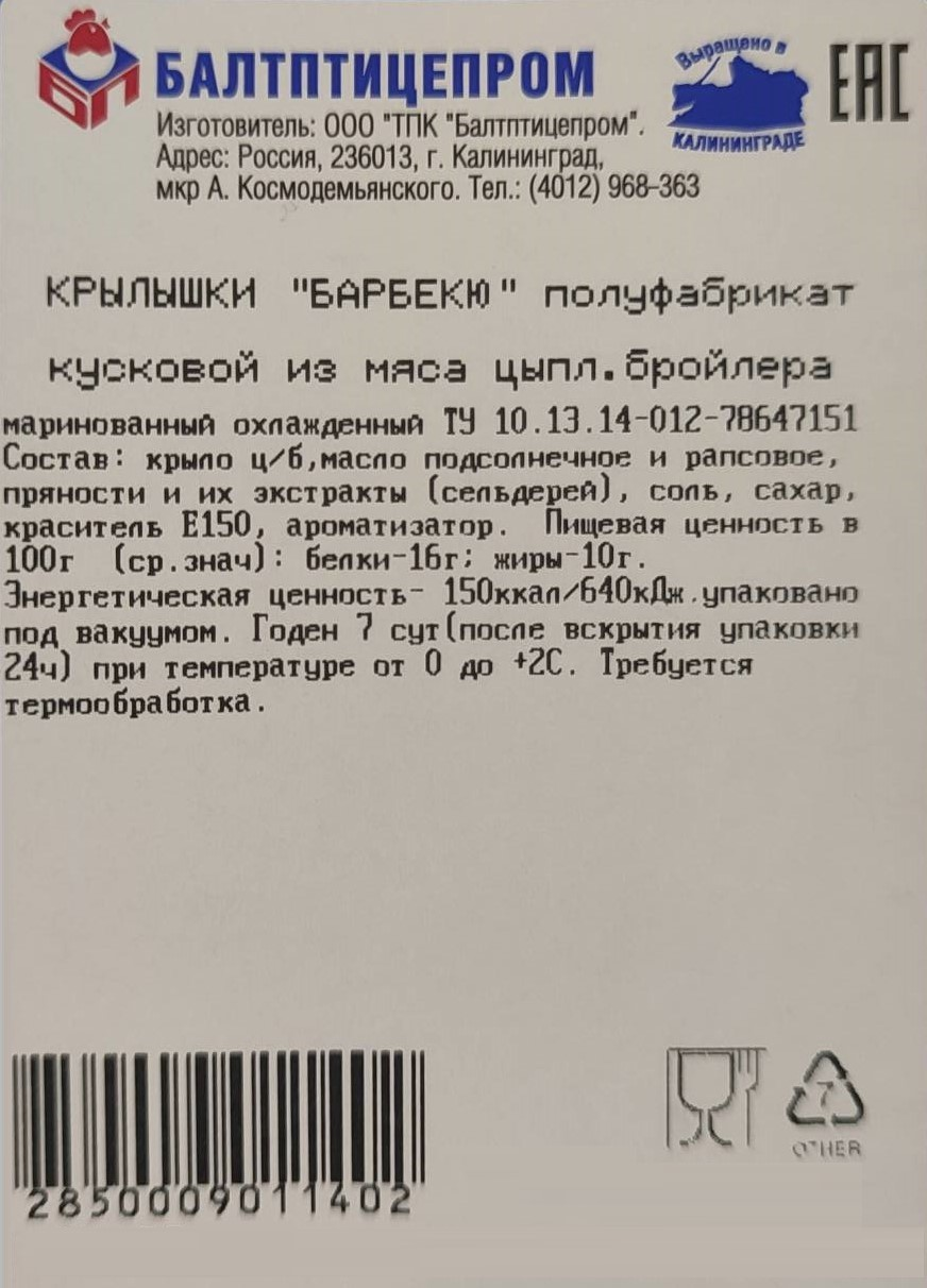Крылышки цыпленка-бройлера Балтптицепром барбекю охлажденные, ~1.3кг