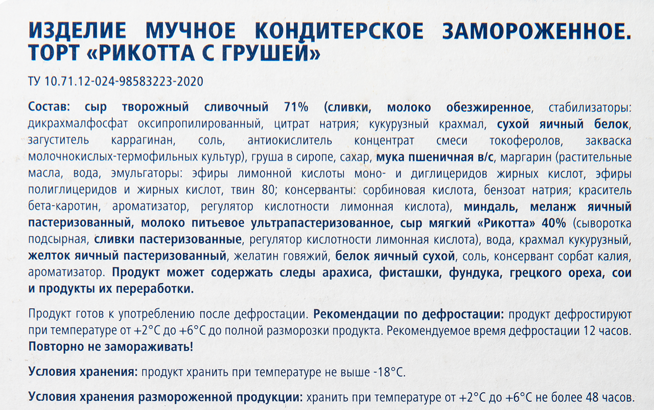 Сыр творожный сливочный 71% сливки, молоко обезжиренное, стабилизаторы: дикрахмалфосфат оксипропилированный, цитрат натрия, кукурузный крахмал, сухой яичный белок, загуститель каррагинан, соль, антиокислитель концентрат смеси токоферолов, закваска молочнокислых-термофильных культур, груша в сиропе, сахар, мука пшеничная, маргарин растительные масла, вода, эмульгаторы: эфиры лимонной кислоты моно - и диглицеридов жирных кислот, эфиры полиглицеридов и жирных кислот, твин 80, консерванты: сорбиновая кислота, бензоат натрия; краситель бета-каротин, ароматизатор, регулятор кислотности лимонная кислота, миндаль, меланж яичный пастеризованный, молоко питьевое ультрапастеризованное, сыр мягкий Рикотта 40% сыворотка подсырная, сливки пастеризованные, регулятор кислотности лимонная кислота, вода, крахмал кукурузный, желток яичный пастеризованный, желатин говяжий, белок яичный сухой, соль, консервант сорбат калия, ароматизатор.