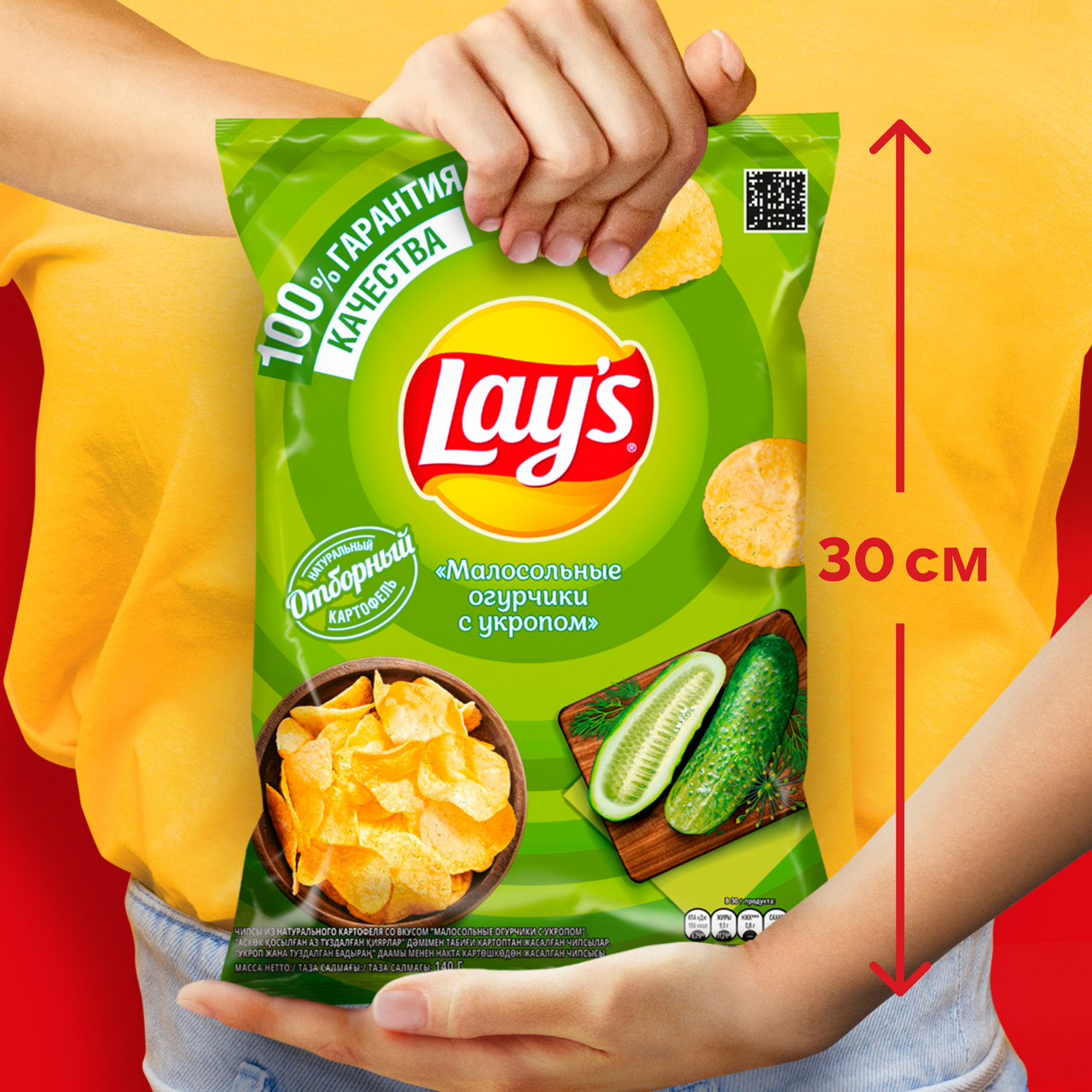 Lay's - чипсы, каждая пачка которых изготовлена из специально отобранного картофеля и соответствует самым высоким стандартам качества.Вкус аппетитных малосольных огурчиков с укропом в сочетании с хрустящими чипсами из натурального картофеля.Каждый день вкуснее с Lay's.