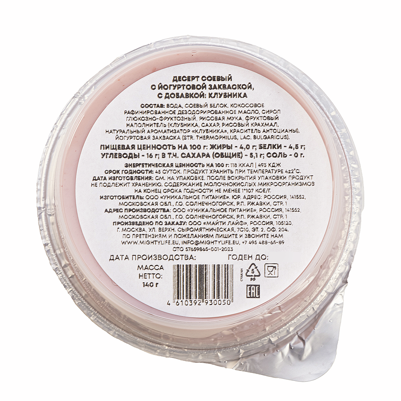 Десерт представляет собой растительный йогурт с нежным вкусом клубники. Продукт на 100% веганский, без лактозы, соответствует тренду на правильное питание и здоровый образ жизни. На натуральных йогуртовых заквасках, в которых отсутствует следы животного и молочного происхождения.