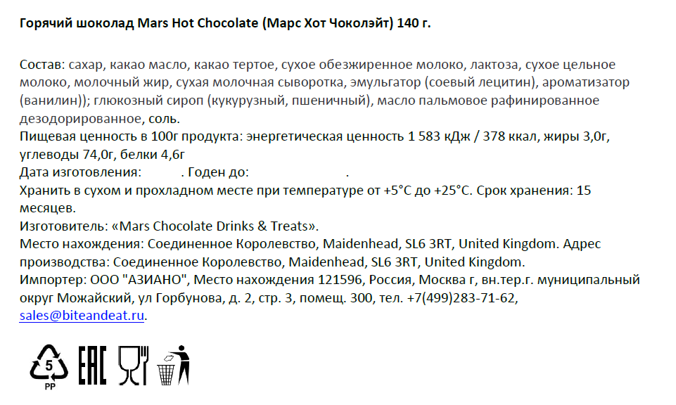 Горячий шоколад Mars Hot Chocolate это наслаждение насыщенным вкусом и ароматом с шоколадными, карамельными и ванильными нотками. Горячий шоколад - отличный выбор для тех, кто ценит сочетание насыщенного аромата и нежной текстуры. Этот импортный горячий шоколад поставляется в удобной упаковке весом 140 грамм, что позволяет наслаждаться его вкусом в любое время суток. Горячий шоколад - это не просто вкусный напиток, но и возможность прикоснуться к традициям европейской кулинарии.