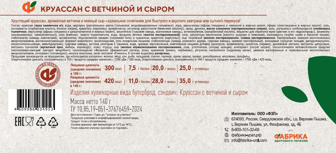 Круассан (мука пшеничная в/с, вода, маргарин (растительные масла (пальмовое, модифицированные пальмовые), вода, эмульгаторы (эфиры глицерина и лимонной и жирных кислот, эфиры полиглицерина и жирных кислот), соль, консерванты (сорбиновая кислота, бензоат натрия), краситель (каротины), ароматизатор, регулятор кислотности (лимонная кислота)), сахар, дрожжи, масло сливочное (пастеризованные сливки), соль, улучшитель для теста (соевая мука, пшеничная клейковина, эмульгатор (моно- и диглицериды жирных кислот), стабилизатор (альгинат натрия), антиоксидант (аскорбиновая кислота), ферменты (ксиланаза, а-амилаза, глюкозооксидазы)), соус (майонез (вода, масло подсолнечное, сахар, продукты яичные сухие, стабилизаторы (гуаровая камедь, ксантановая камедь), соль, кислота уксусная, консервант (сорбат калия), ароматизатор горчица, краситель (каротин)), сыр творожный (молоко пастеризованное, сливки пастеризованные, бактериальные закваски молочнокислых микроорганизмов, молокосвертывающий фермент, соль, стабилизаторы (камедь рожкового дерева, гуаровая камедь), крахмал картофельный), консервант (сукцинат кальция, дигидрокверцетин, эпсилон-поли-L-лизин, мальтодекстрин), гуаровая камедь), ветчина категории Б (свинина, вода, крахмал картофельный, комплексная пищевая добавка (декстроза, ароматизатор, краситель (кармин), дрожжевой экстракт, экстракты цитрусовых, экстракты пряностей (мускатный орех, имбирь, кориандр)), соль), огурцы, сыр (молоко нормализованное пастеризованное, соль, уплотнитель (хлорид кальция), консервант (нитрат натрия), технологическое вспомогательное средство (молокосвертывающий препарат (ферментный раствор, соль), красители (аннато, норбиксин), регулятор кислотности (гидроксид калия), закваска мезофильных и термофильных молочнокислых микроорганизмов, консервант (натамицин)), капуста пекинская, салат листовой "Романо".