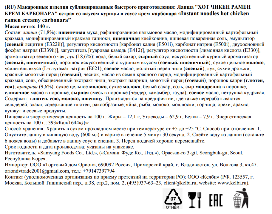Легендарная и невероятно острая лапша из Южной Корей со вкусом курицы и крем карбонары. Попробовав эту лапшу погружаешься в сочетание вкусов сливочного сыра, бекона и остроты, новые и интересные вкусовые ощущения обеспечены. Рекомендуем готовить именно так, как написано на упаковке, только так можно насладиться полным вкусом этого продукта.