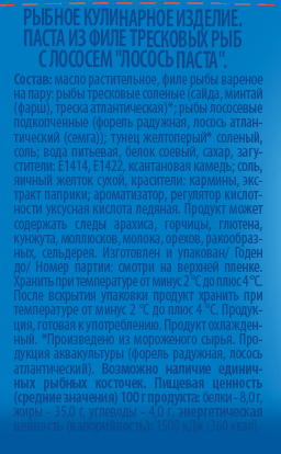 Лосось Паста - паста из филе рыбы. В основе продукта - филе тресковых пород рыб, благодаря чему ощущение текстуры - сбалансированное и мягкое, а структура с выраженной волокнистостью и объемом. В сочетании с лососем паста формирует свойственный узнаваемый вкус. Вкусовое впечатление - полноты вкуса, питательности и легкой усвояемости.