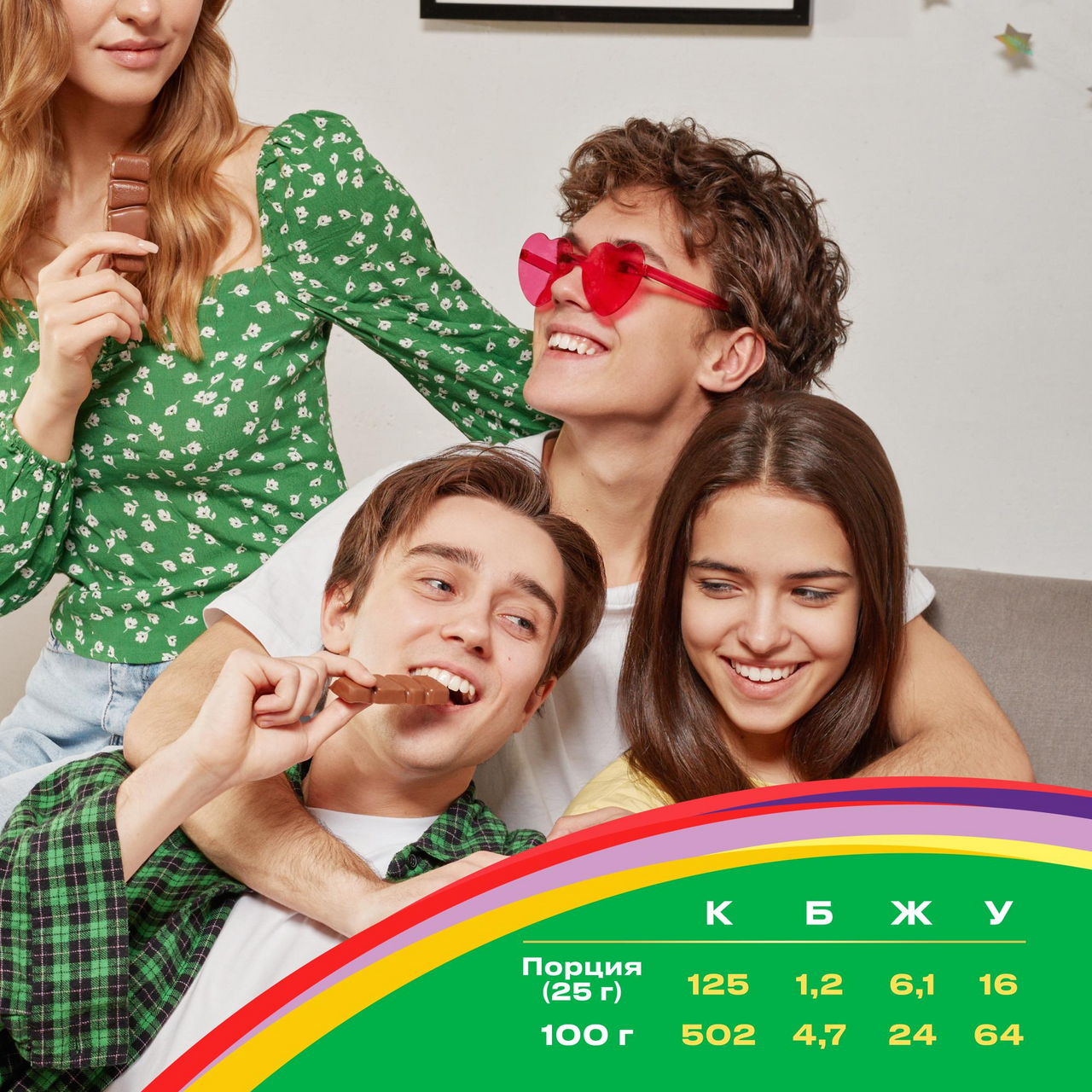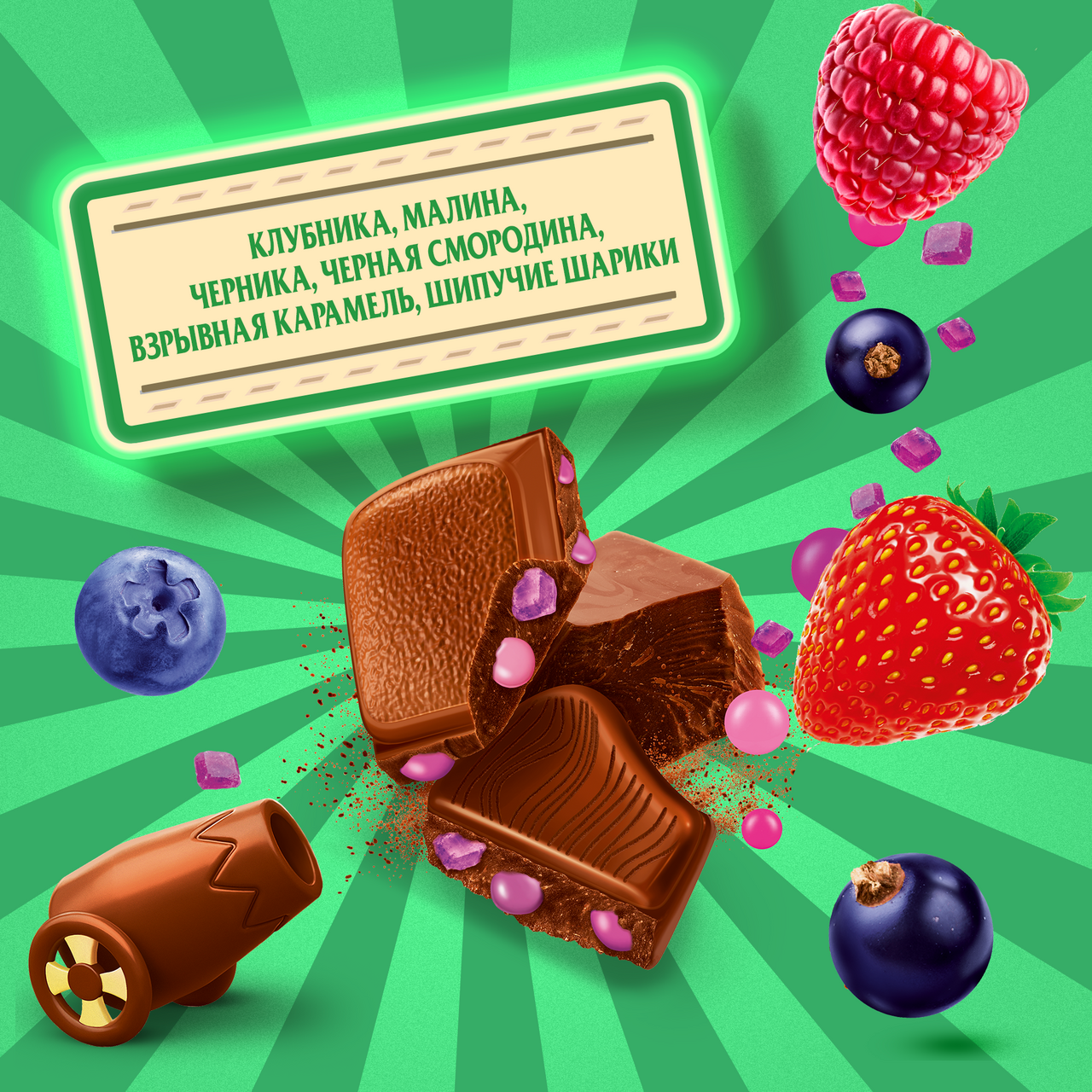 Шоколад молочный (сахар, какао тертое, масло какао, сыворотка сухая молочная, молоко сухое цельное, жир молочный, молоко сухое обезжиренное, эмульгаторы (лецитин соевый, Е476), ароматизатор); фруктово-ягодные кусочки со вкусом клубники, малины, черники, черной смородины (пюре яблочное концентрированное, пюре ягодное (малина, клубника, черника, черная смородина), сироп глюкозно-фруктозный, сироп глюкозный, сахар, агент влагоудерживающий (глицерин), волокна пшеничные пищевые, жир растительный (масло пальмовое), желирующий агент (пектины), регуляторы кислотности (кислота яблочная, кислота лимонная), концентрат сока моркови, концентрат сока черники, натуральный ароматизатор); шипучие рисовые шарики со вкусом малины (сахар, мука рисовая, масло какао, регуляторы кислотности (кислота лимонная, гидрокарбонат натрия), молоко сухое цельное, лактоза (из молока), крахмал тапиоковый, концентрат сока редиса красного, молоко сухое обезжиренное, глазирователь (шеллак), эмульгатор (лецитин подсолнечный), сироп глюкозный, соль, концентрат сока черной смородины, концентрат яблочного сока, ароматизаторы); кусочки карамели со вкусом малины (сахар, сироп глюкозный, ароматизатор натуральный, жир молочный, концентрат яблочного сока, концентрат сока черной смородины, концентрат сока редиса красного, регулятор кислотности (кислота лимонная)); взрывная карамель (сахар, сироп глюкозный, лактоза (из молока)).