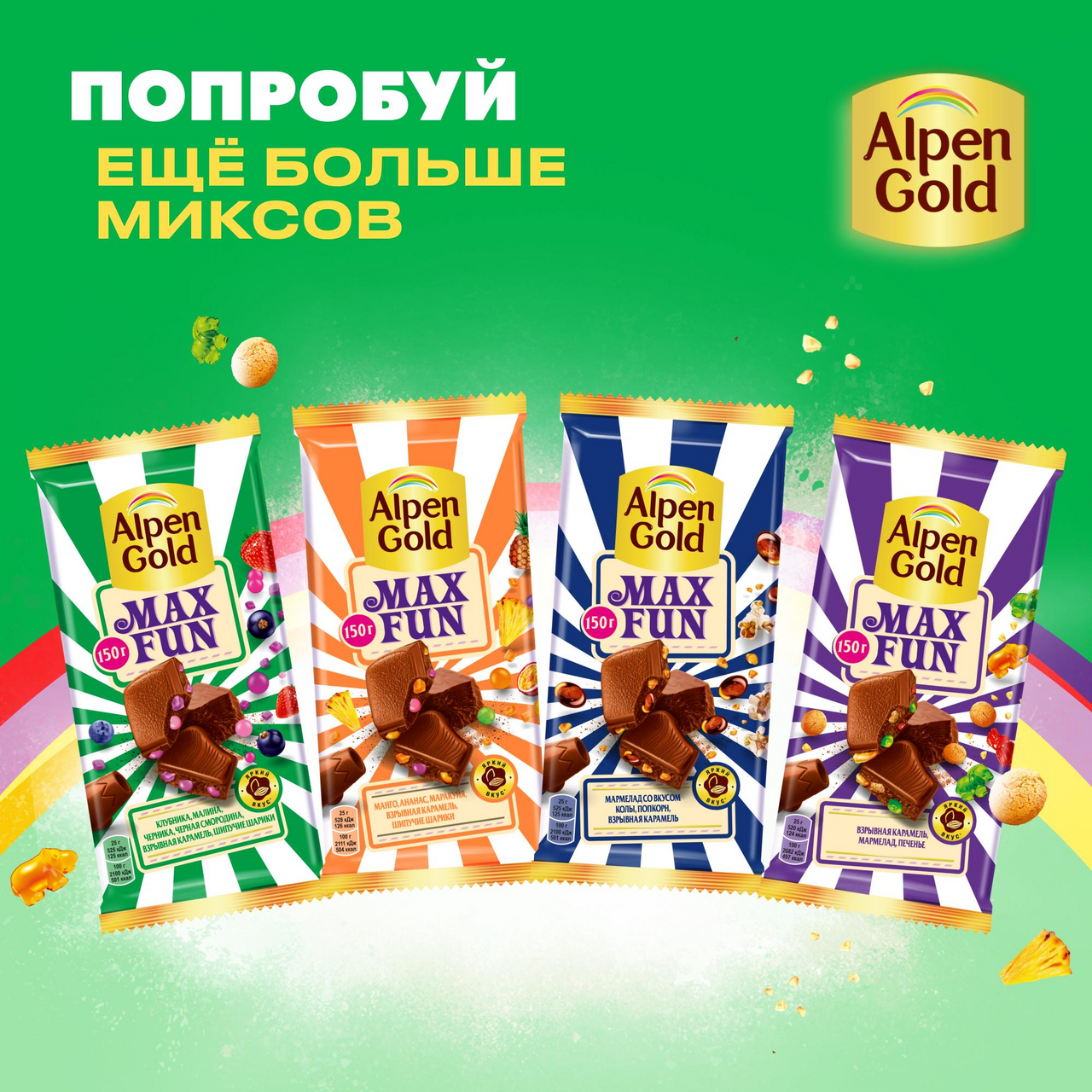 Alpen Gold уже более 25 лет радует ценителей шоколада необычными вкусовыми сочетаниями. Alpen Gold Max Fun — это сюрприз в каждом кусочке: никогда не знаешь, что попадется именно сейчас. Нежный белый шоколад дополнен сочными фруктово-ягодными кусочками со вкусом клубники, малины, черники и черной смородины. Взрывная карамель и шипучие рисовые шарики добавляют вкусу яркости и веселья, поэтому точно не дадут скучать! Шоколад белый Alpen Gold производится по высоким стандартам качества из какао-продуктов. Шоколад с мармеладом заряжает отличным настроением и приглашает к вкусным открытиям. Alpen Gold Max Fun — это яркие миксы из молочного шоколада, взрывной карамели, шипучих шариков, мармелада и фруктово-ягодных кусочков. Попробуй все вкусы Alpen Gold Max Fun: жуй, хрусти и выбери из них свой любимый! Большой плитки шоколада Alpen Gold Max Fun хватит на целую компанию друзей: его можно взять с собой на учебу, в гости или на вечеринку. Яркий вкус веселья вместе с Alpen Gold!