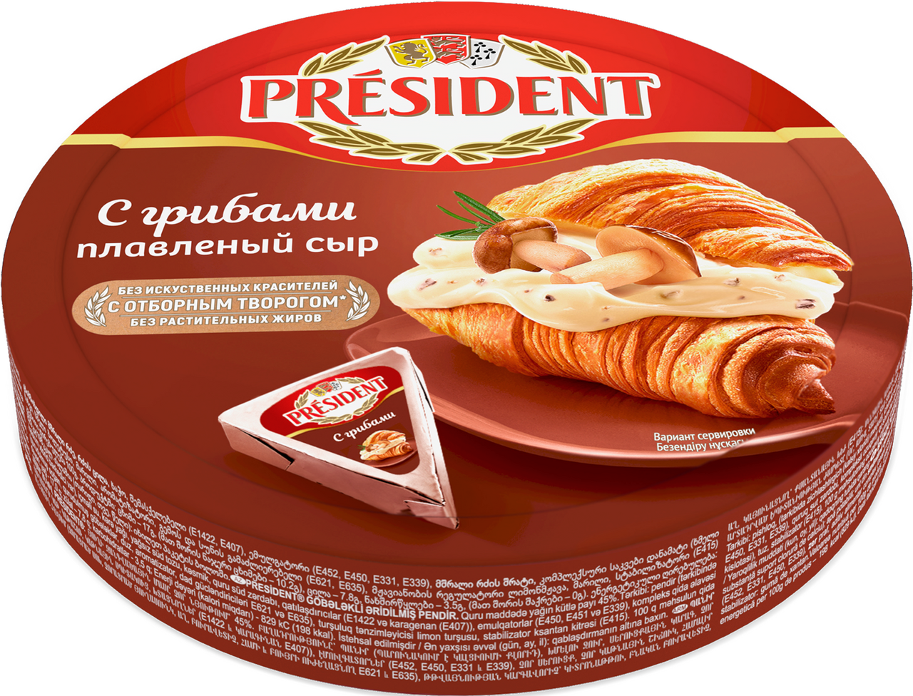 Сыр President в ванночке превосходно подходит для вкусного, быстрого и сытного завтрака, сочетаясь с мясными и рыбными нарезками, зеленью и овощами.Нежный плавленый сыр приготовлен с добавлением сушеных боровиков.Грибы придают сыру неповторимый тонкий аромат. Попробуйте с серым хлебом, поджаренным до румяного цвета!Плавленый сыр можно использовать как начинку для румяных булочек: в духовке он становится кремовым и тягучим, но не течет и не расслаивается. Сы��ные булочки прекрасно дополнят легкие супы типа минестроне.Состав: сыр, масло сливочное, молоко сухое обезжиренное, вода питьевая, творог, эмульгаторы (Е339, Е452), загустители Е1442 и Е407а, комплексная пищевая добавка (ароматизатор "Грибы", усилитель вкуса и аромата Е621 и Е635, сушеные грибы - боровики), регулятор кислотности - лимонная кислота, консервант - низин.Хранить при температуре от +2C до +6CСрок годности: 8 месяцев
