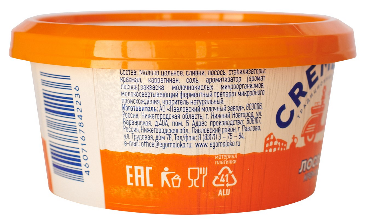 Молоко цельное, сливки, лосось, стабилизаторы: крахмал, каррагинан, соль, ароматизатор (аромат лосось), закваска молочнокислых микроорганизмов, молокосвертывающий ферментный препарат микробного происхождения, краситель натуральный.