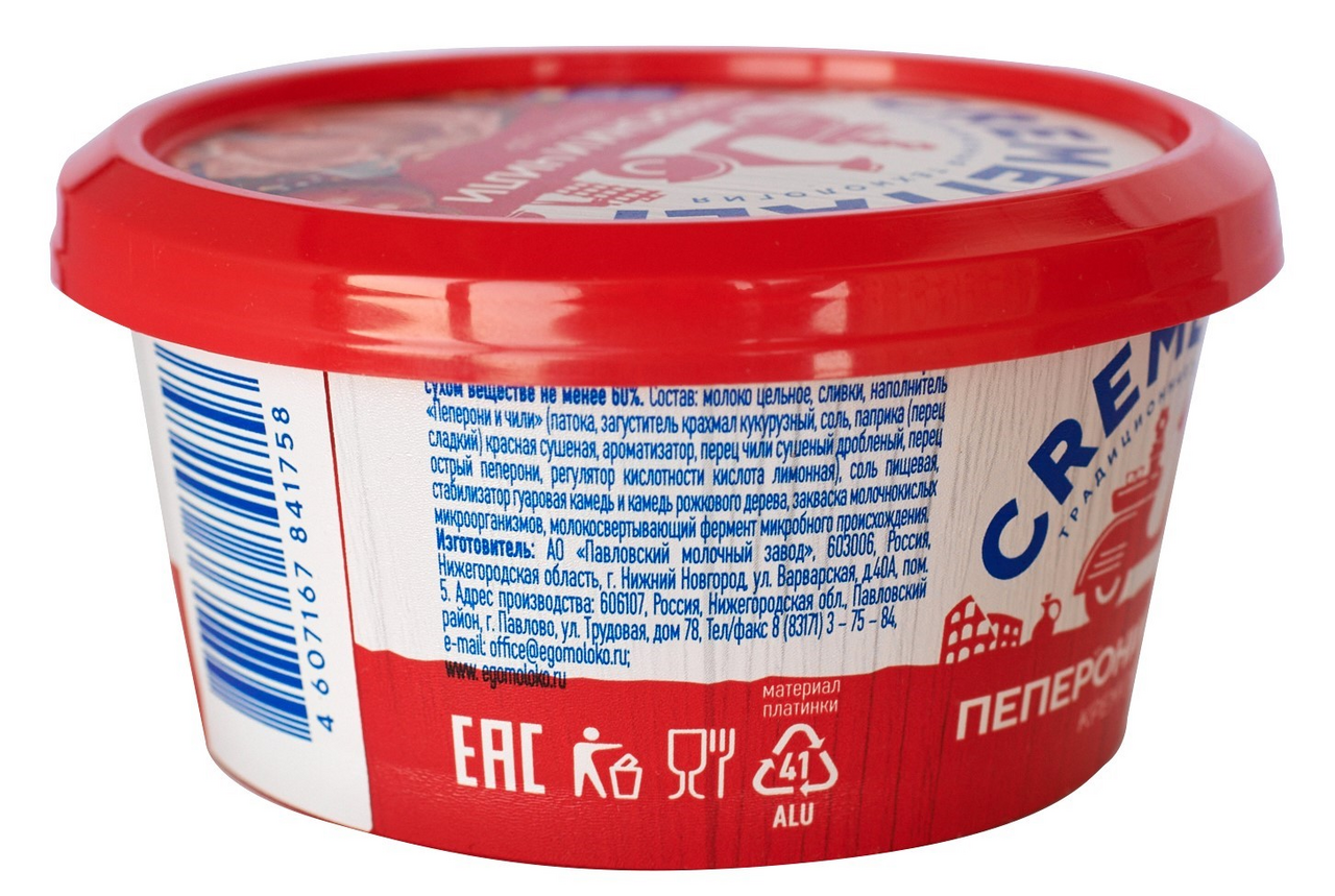 Молоко цельное, сливки, наполнитель Пепперони и чили (патока, загуститель, крахмал кукурузный, соль, паприка (перец сладкий) красная сушёная, ароматизатор, перец чили сушёный дроблёный, перец острый пеперони, регулятор кислотности кислота лимонная, соль пищевая, стабилизатор гуаровая камедь и камедь рожкового дерева, закваска молочных микроорганизмов, молокосвертывающий фермент микробного происхождения.