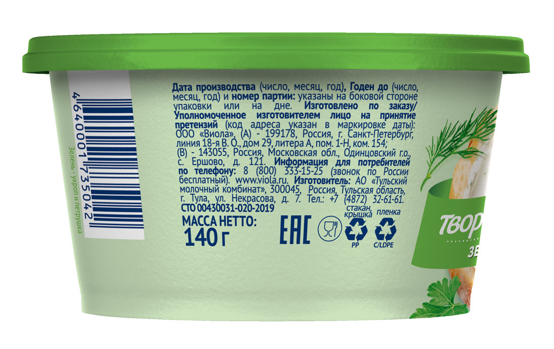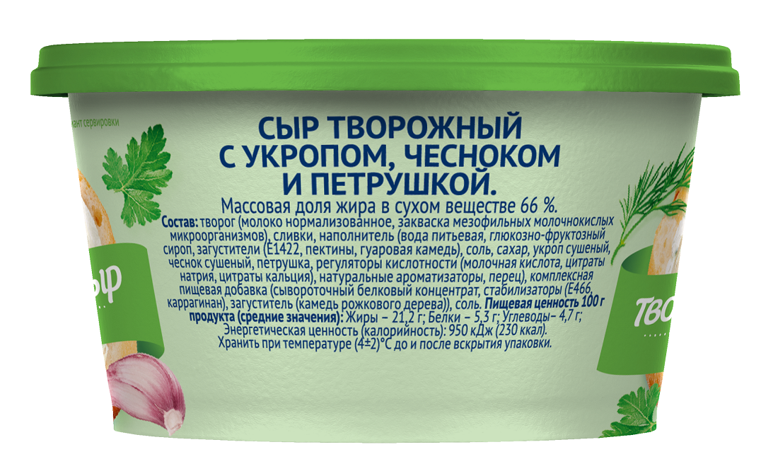 Творог (молоко нормализованное, закваска мезофильных молочнокислых микроорганизмов), сливки, наполнитель (вода питьевая, глюкозно-фруктозный сироп, загустители (Е1422, пектины, гуаровая камедь), соль, сахар, укроп сушеный, чеснок сушеный, петрушка, регуляторы кислотности (молочная кислота, цитраты натрия, цитраты кальция), натуральные ароматизаторы, перец), комплексная пищевая добавка (сывороточный белковый концентрат, стабилизаторы (Е 466, каррагинан), загуститель (камедь рожкового дерева)), соль.