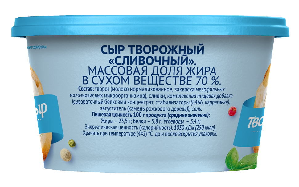 Творог (молоко нормализованное, закваска мезофильных молочнокислых микроорганизмов), сливки, комплексная пищевая добавка (сывороточный белковый концентрат, стабилизаторы (Е466, каррагинан), загуститель (камедь рожкового дерева)), соль.