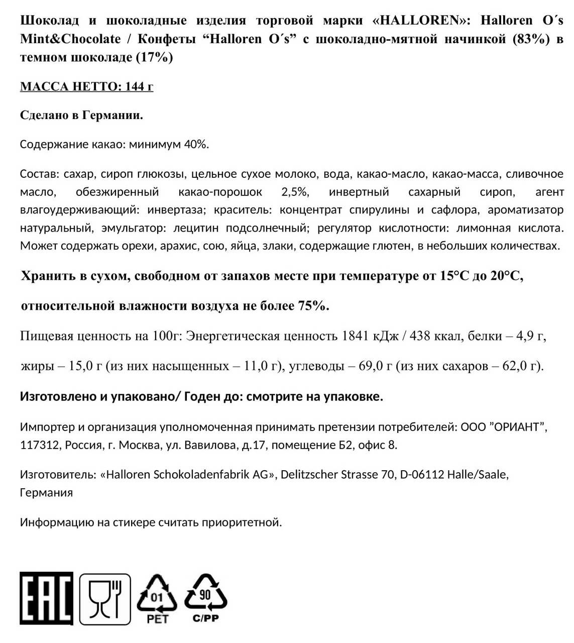 Конфеты Halloren шоколадные O'S мята и шоколад, 144г