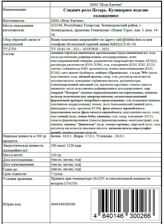 Тортилья 25см мука пшеничная, вода, масло подсолнечное рафинированное дезодорированное, сахар, разрыхлители гидрокарбонат натрия, Е450 I, соль (соль, агент антислеживающий Е536), глютен пшеничный, эмульгатор Е471, регулятор кислотности Е296, консервант Е223, Куриное филе грудки, Майонез масло подсолнечное рафинированное дезодорированное, вода питьевая, яичный желток, сахар, соль, регулятор кислотности уксусная кислота, консервант сорбиновая кислота, ароматизаторы, концентрированный лимонный сок, краситель каротины, Помидоры слайсами, Капуста пекинская свежая, Чеснок свежий очищенный, Жидкая глюкоза ферментированная Глюкоза ферментированная, Мальтодекстрин Носитель, Соль, Масло растительное рафинированное, анчоусы консервированные в масле филе анчоуса европейского, подсолнечное масло, соль, Горчица дижонская вода, семена горчицы, спиртовой уксус, соль, регулятор кислотности лимонная кислота, антиокислитель пиросульфит калия, Соус Ворчестер вода, сахар, соль, уксусная кислота регулятор кислотности, растительный белок кукурузный, глюкозный сироп тростниковый, Е150с краситель, эфирное масло гвоздики, лимона, Паприка сладкая молотая, Соевый соус Metro Chef, Сен Сой professional вода, соевые бобы, пшеница, соль, Сыр Пармезан тёртый покупной пастеризованное коровье молоко, бактериальная закваска мезофильных и термофильных молочнокислых микроорганизмов, уплотнитель хлорид кальция, соль пищевая, молоко свёртывающий ферментный препарат микробного происхождения mucor miehei, поверхностная обработка консервантом нитамицин.