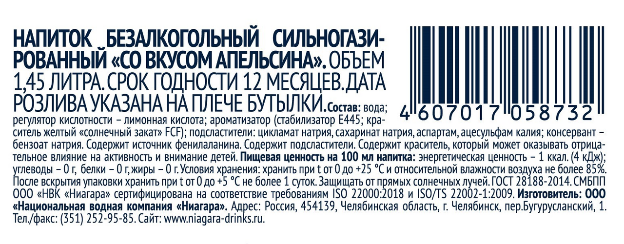 Вода очищенная специально подготовленная (обогащена йодом до 125 мкг/д, фтором до 1,5 мг/л), лимонная кислота, подсластитель Свитлэнд 200С, идентичный натуральному ароматизатор Апельсин, краситель - Карамельный колер, консервант - бензоат натрия.