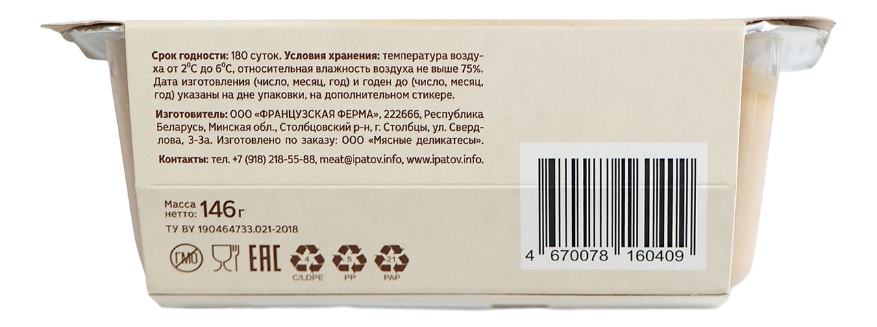 Печень цыплят-бройлеров, вода, печень утиная жирная, жир утиный топлёный, жир сырец куриный, масло из коровьего молока высшего сорта несолёное, мясо кусковое окорочков цыплят бройлеров, крахмал картофельный, комплексная пищевая добавка (соль поваренная пищевая выварочная экстра, фиксатор окраски (нитрит натрия) йодат калия) сахар, соль поваренная пищевая йодированная, экстракт чёрного перца, тимьян, антиокислитель (аскорбиновая кислота, L-).