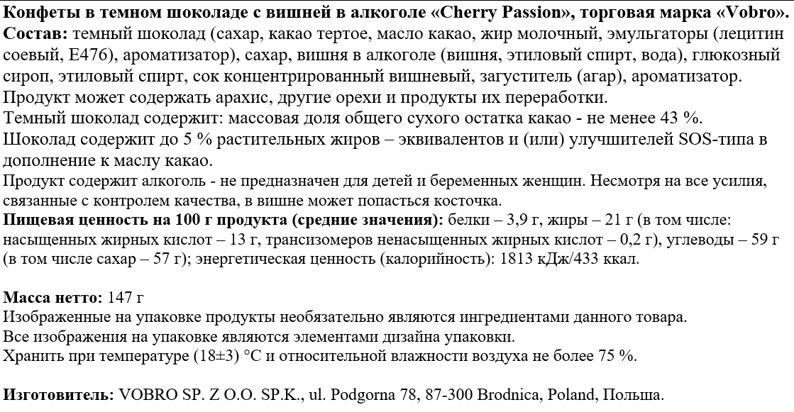 Темный шоколад (сахар, какао тертое, масло какао, жир молочный, эмульгаторы (лецитин соевый, Е476), ароматизатор), сахар, вишня в алкоголе (вишня, этиловый спирт, вода), глюкозный сироп, этиловый спирт, сок концентрированный вишневый, загуститель (агар), ароматизатор. Продукт может содержать арахис, другие орехи и продукты их переработки. Темный шоколад содержит: массовая доля общего сухого остатка какао - не менее 43 %. Шоколад содержит до 5 % растительных жиров – эквивалентов и (или) улучшителей SOS-типа в дополнение к маслу какао. Продукт содержит алкоголь - не предназначен для детей и беременных женщин. Несмотря на все усилия, связанные с контролем качества, в вишне может попасться косточка.
