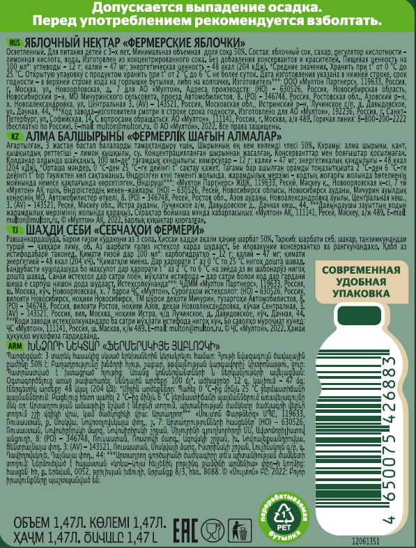 Нектар Добрый фермерские яблочки, 1.47л x 6 шт