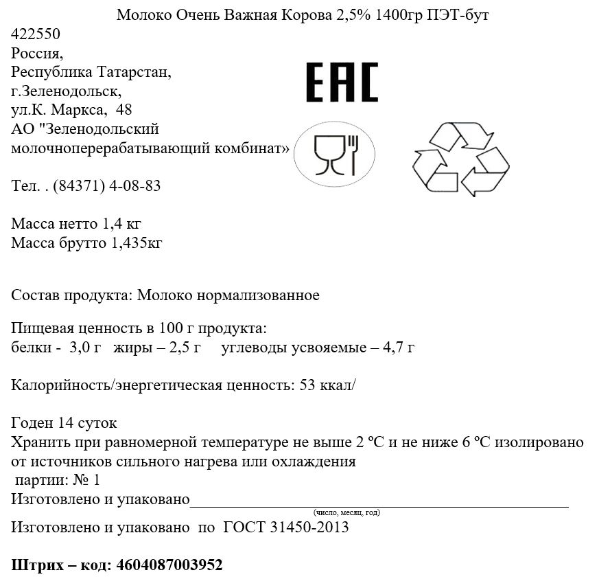 Молоко Очень важная корова Халяль 2.5%, 1.4кг