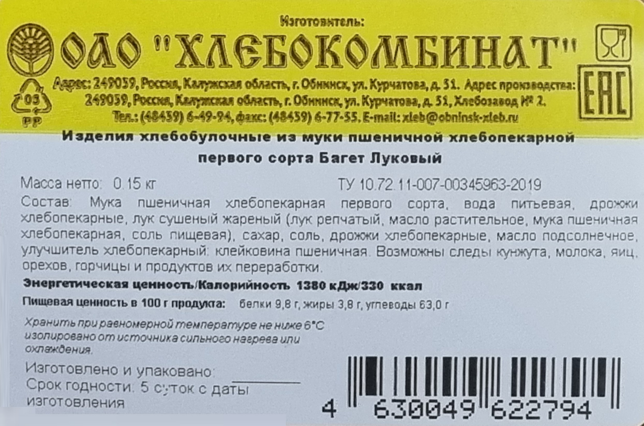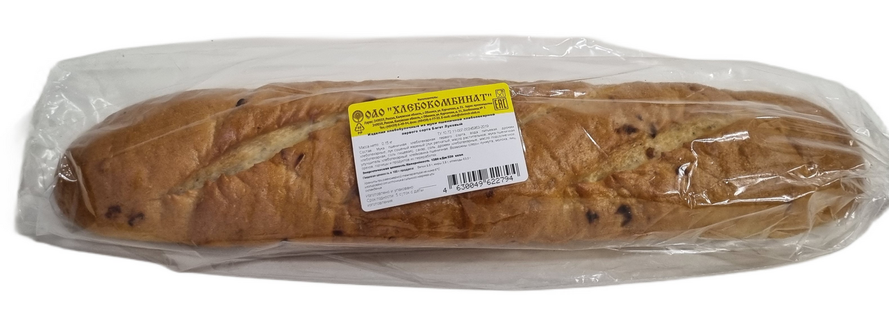 Изделия хлебобулочные из муки пшеничной хлебопекарной первого сорта с луком. Прекрасно сочетается с первыми блюдами. Хрустящий аппетитный хлеб, приготовленный по фирменному рецепту с добавлением жареного лука. Он отлично подходит для приготовления всевозможных бутербродов и сытных тостов с различными начинками. Оригинальный луковый багет обязательно станет любимым продуктом у всех членов семьи.