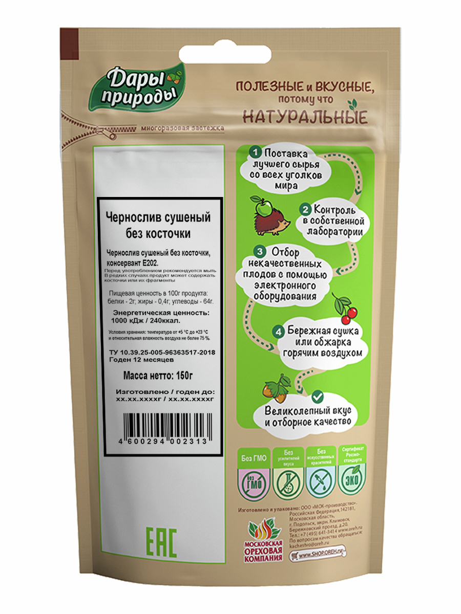 Чернослив Дары природы сушеный без косточек, 150 г – это полезный сухофрукт. Он имеет очень мягкую мякоть, внутри которой нет косточки. Чернослив содержит в себе большое количество антиоксидантов, пищевые волокна, сорбит и изатин. Он известен своим слабительным действием. Часто его используют для регулирования работы пищеварительной системы. Перекус черносливом приносит быстрое чувство насыщения и уменьшает последующее количество потребления пищи, помогая контролировать переедание. Чернослив выступает неотъемлемым ингредиентом в различных сытных и фруктовых салатах, а также в десертах. В него кладут грецкий орех и сверху делают шапочку из нежным взбитых сливок. Чернослив вместе с курагой и цедрой лимона перекручивают на мясорубке и формируют небольшие шарики, которые прекрасно заменяют собой высококалорийные конфеты. Представленный продукт поставляется в удобной для транспортировки и хранения упаковке. Дары природы: Сливу для чернослива мы выращиваем сами на своих полях в Ростовской области. Потом сами ее сушим, удаляем косточку и фасуем уже готовый чернослив. Мы полностью, от ветки до пакета, контролируем отменное качество нашего продукта. Наш чернослив просто тает во рту и является настоящим кладезем полезных веществ.
