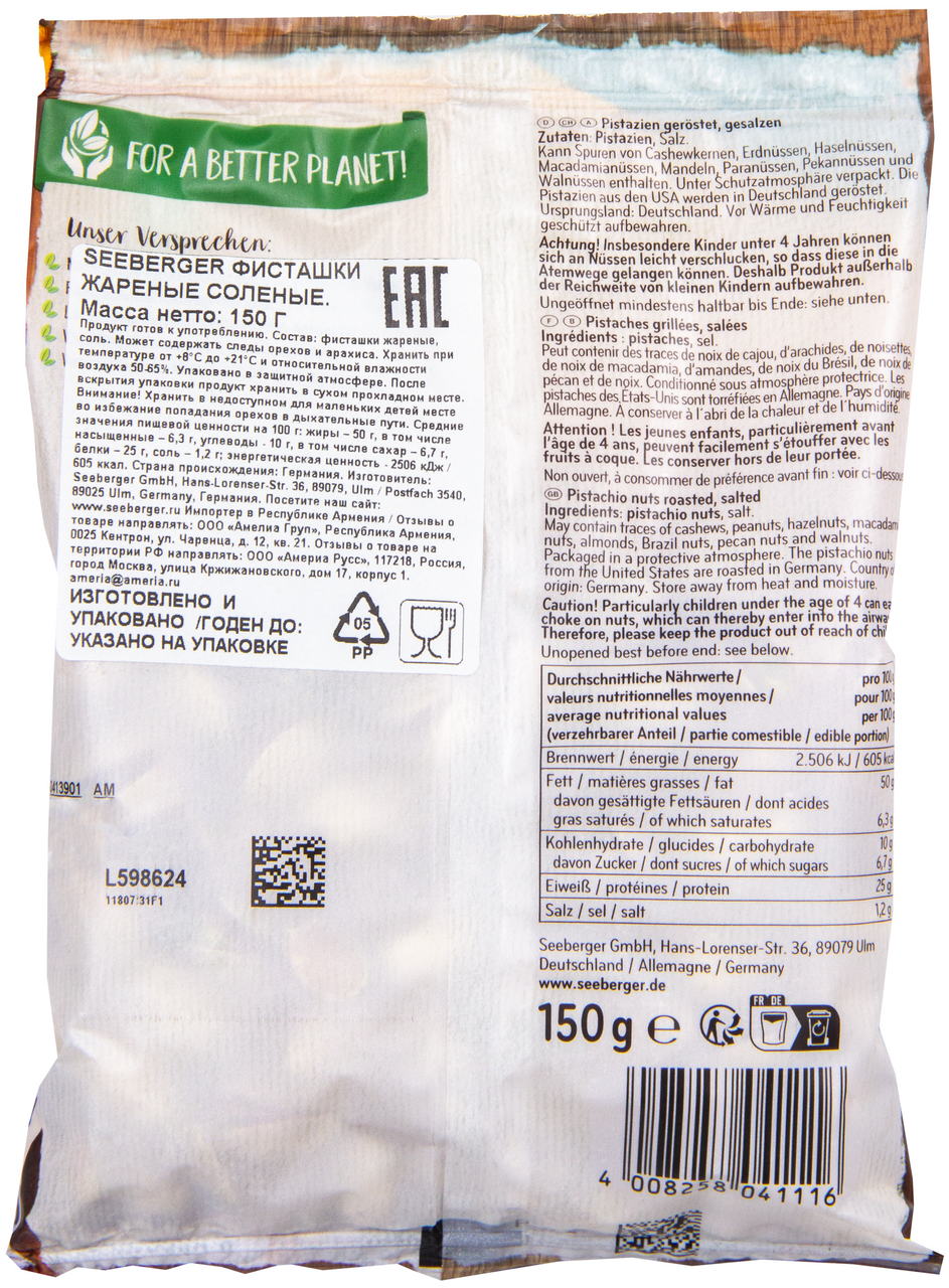 Жареные фисташки с солью от Seeberger идеальны для полезного перекуса. Компания использует качественное сырьё - выбирает крупные, зрелые фисташки.