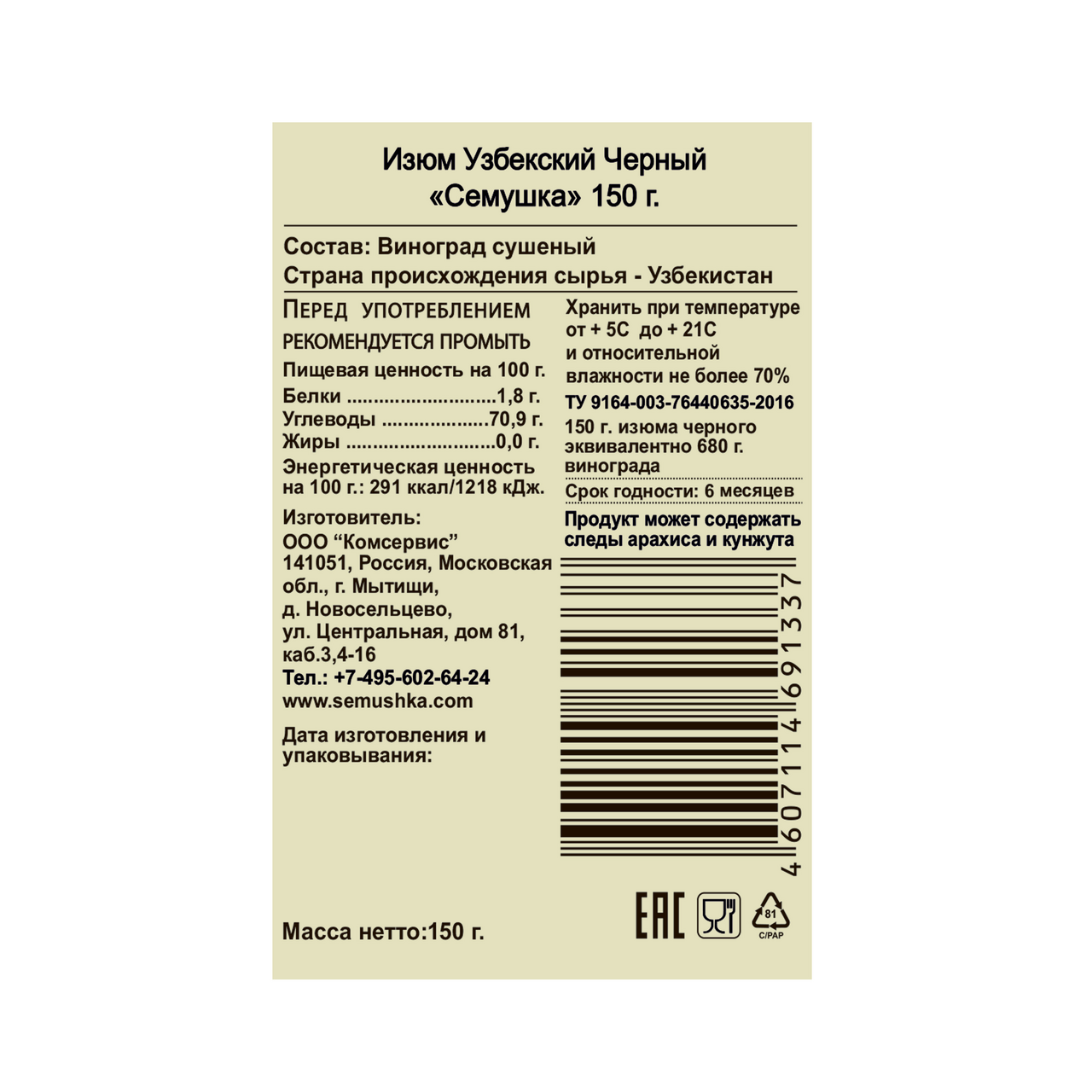 Изюм узбекский – сушёные ягоды винограда, является одним из самых распространённых и полезных видов сухофруктов. Изюм произведён из сортов винограда, собранных в Средней Азии, имеет синеватый налёт, поэтому его часто называют не тёмным или чёрным, а синим. Эта ягода сама по себе очень удивительная: после высушивания ее полезные свойства приумножаются в несколько раз. Ягоды перед сушкой проходят этап тщательной сортировки. Это ценный источник необходимых организму полезных веществ. Изюм богат белком, витаминами В, С, Е, К, калием, кальцием, магнием, железом, цинком. Отлично подходит для полезного перекуса взрослым и детям.