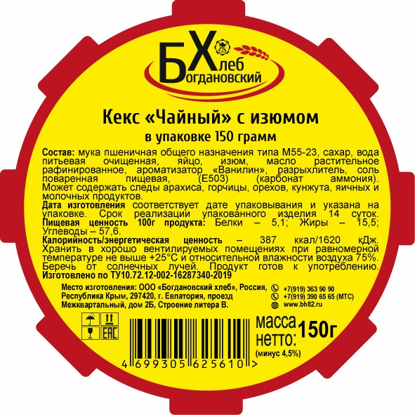 Мука пшеничная общего назначения типа М55-23, сахар, вода питьевая очищенная, яйцо, изюм, масло растительное рафинированное, ароматизатор Ванилин, разрыхлитель, соль поваренная пищевая, (Е503) (карбонат аммония).