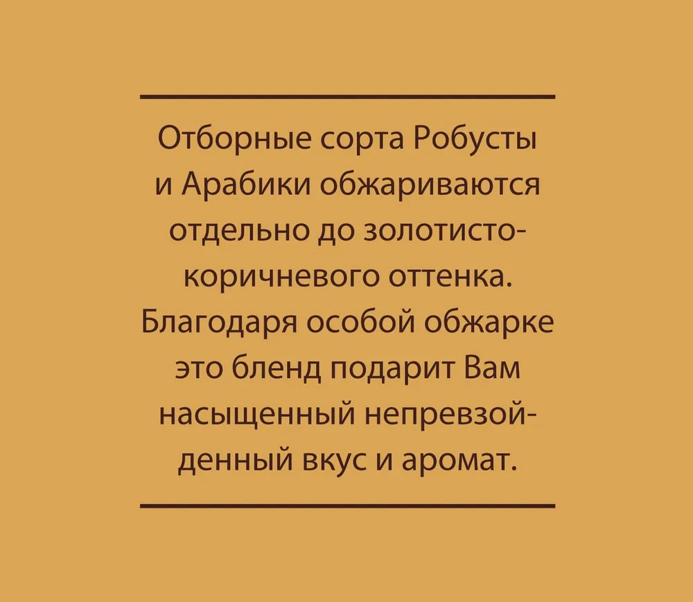 Производится из отборных зерен Арабики и Робусты. Каждый сорт обжаривается отдельно до золотисто-коричневого оттенка, благодаря чему бленд приобретает уникальный насыщенный вкус и утонченный аромат. Кофе быстро растворяется в горячей воде, поэтому отлично подходит для тех, у кого на счету каждая минута. Готовый напиток взбодрит вас ранним утром, подарит прилив энергии для новых достижений и поможет отвлечься от насущ��ых забот. При желании можете добавить в него сахар, молоко или сливки.