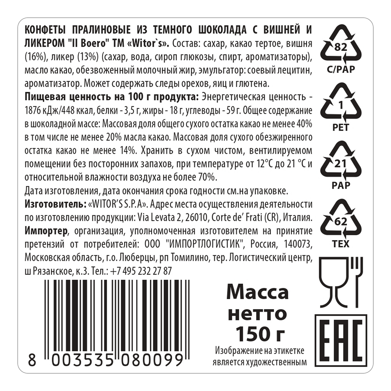 Набор шоколадных конфет Witor's Il Boero с вишней и ликером, 150г