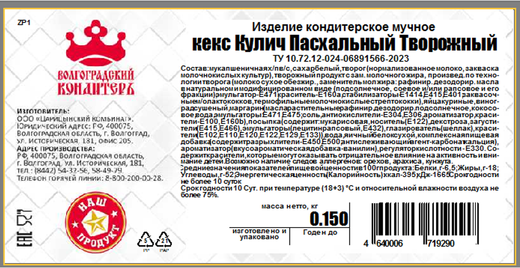 Кулич Волгоградский кондитер Пасхальный творожный, 150г