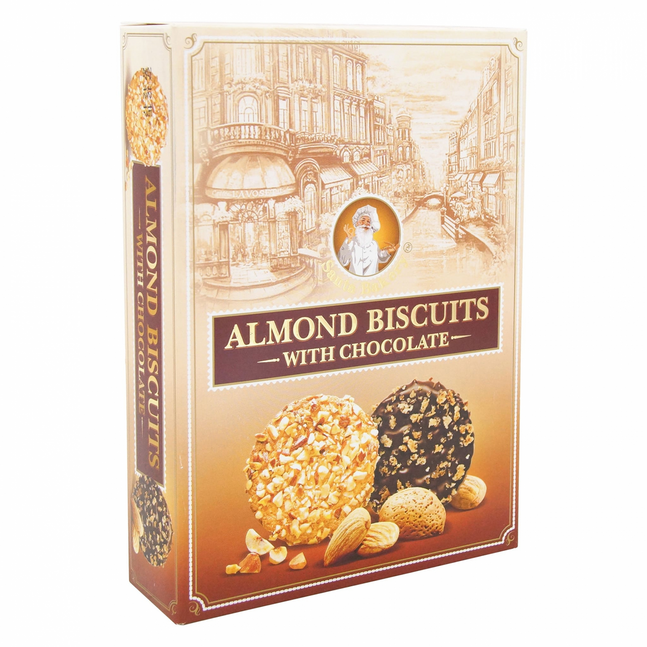 Поверхность этого нежно хрустящего печенья декорируется дробленым миндалем (15 %). Донышко печенья покрывается шоколадом (25 %) с миндальной бисквитной крошкой (10 %), которая предотвращает слипание двух печений.