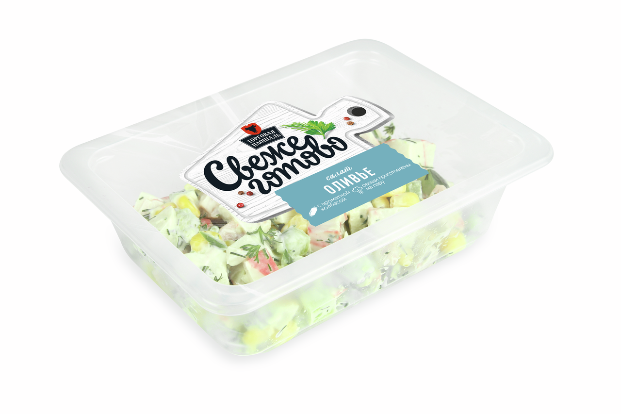 Колбаса вареная мясо куриное ручной и механической обвалки, вода, эмульсия шкурки свиной, сыворотка сухая молочная, крахмал картофельный, нитритно - посолочная смесь соль, фиксатор окраски нитрит натрия, соль, экстракты специй, сахара, усилитель вкуса глутамат натрия, загустители каррагинан, гуаровая камедь, ксантановая камедь, регуляторы кислотности пирофосфаты, триполифосфаты натрия, стабилизатор полифосфаты натрия, антиокислитель аскорбат натрия, желирующий агент хлорид калия, ароматизатор, краситель пищевой кармин, майонез (масло подсолнечное растительное, вода, сахар, уксус, яичный желток, соль, крахмал кукурузный, стабилизатор ксантановая камедь, консервант сорбиновая кислота), масло горчицы, красители бета-каротин, экстракт паприки, яйца куриные, картофель, морковь, горошек зеленый, огурцы консервированные, перец черный, консерванты сорбат калия, бензоат натрия, регулятор кислотности ацетат натрия, антиокислитель дигидрокверцетин. На производстве используются: молоко, злаки, кунжут, горчица, сельдерей, орехи, арахис, яйца куриные, соя, рыба, ракообразные и продукты их переработки.