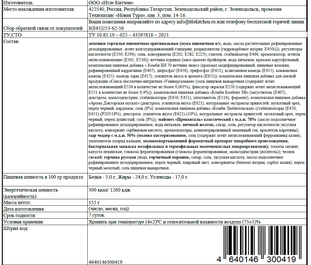 Ветчина из птицы Филе птицы цыплят-бройлеров халяль, комплексная пищевая добавка Шинка Универсальная стабилизаторы Е407а, Е413,Е450,Е452, регулятор кислотности Е451, антиокислитель Е316, соль, крахмал картофельный, вода питьевая, соль поваренная пищевая, комплексная пищевая Нитритная соль поваренная пищевая, фиксатор окраски - нитрит натрия, чеснок, комплексная пищевая добавка Фриш Тау консервант Е223, регуляторы кислотности Е262,Е330, рапсовое масло, Тортилья 20 см 42 гр 0,042кг мука пшеничная в/с, вода, масло подсолнечное рафинированное дезодорированное, сахар, разрыхлители гидрокарбонат натрия, Е450 I, соль (соль, агент антислеживающий Е536), глютен пшеничный, эмульгатор Е471, регулятор кислотности Е296, консервант Е223, Майонез 78% масло подсолнечное рафинированное дезодорированное, вода питьевая, яичный желток, сахар, соль, регулятор кислотности уксусная кислота, консервант сорбиновая кислота, ароматизаторы, концентрированный лимонный сок, краситель каротины, Помидоры слайсами с/м, Капуста пекинская свежая, Сыр Чеддер ломтики Hohland, Соль, Перец чёрный молотый, Чеснок свежий очищенный, Горчица столовая вода, горчичный порошок, сахар, соль, уксусная кислота, масло подсолнечное рафинированное дезодорированное, перец чёрный, лавровый лист, консерванты бензоат натрия, сорбат калия, жидкая глюкоза ферментированная, мальтодекстрин носитель.