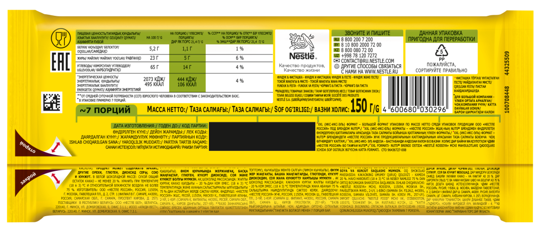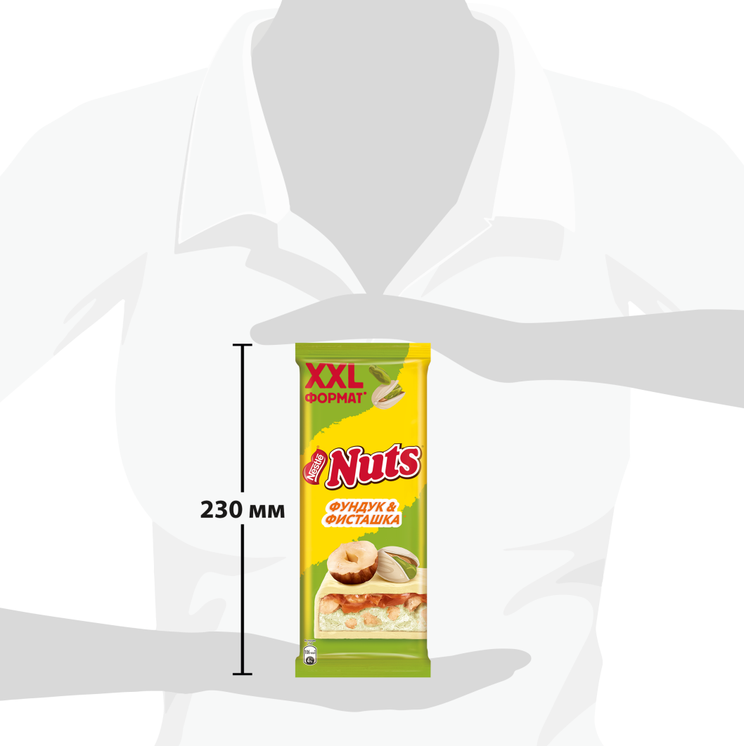 Представляем новую шоколадную плиту Nuts Фундук и Фисташка в белом шоколаде в формате XXL для большой компании. Это классный шоколад с начинкой из нуги и карамели с обжаренным фундуком и тертой фисташкой не только вкусный, но и питательный. Nuts всегда радует своим крутым вкусом и помогает подзарядить мозги, ведь фундук ценится за большое содержание магния и кальция, стимулирующих мозговую активность. Nuts отлично подходит в качестве быстрого перекуса между приемами пищи для себя или чтобы поделиться в компании друзей.
