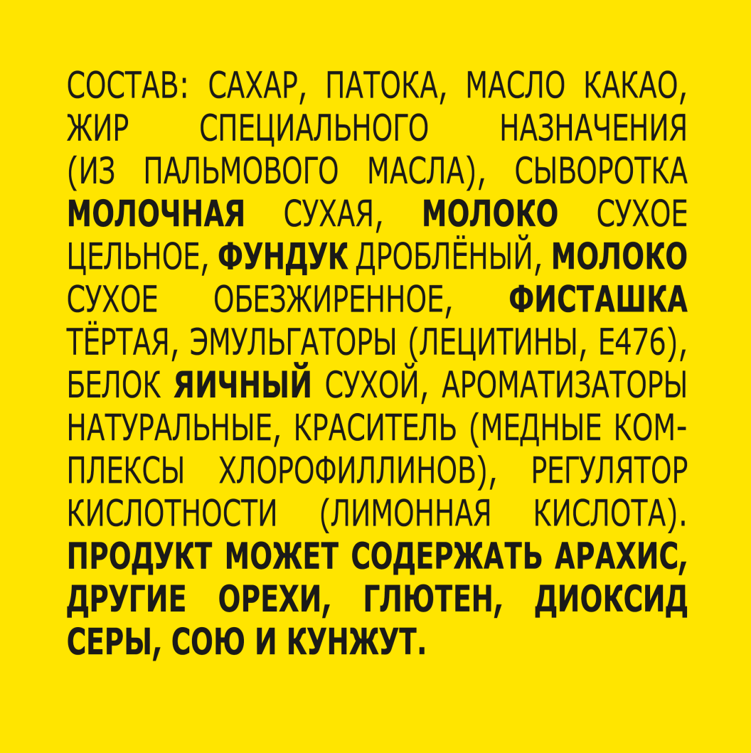 Сахар, патока, масло какао, жир специального назначения (из пальмового масла), сыворотка молочная сухая, молоко сухое цельное, фундук дробленый, молоко сухое обезжиренное, фисташка тертая, эмульгаторы (лецитины, Е476), белок яичный сухой, ароматизаторы натуральные, краситель (медные комплексы хлорофиллинов), регулятор кислотности (лимонная кислота).