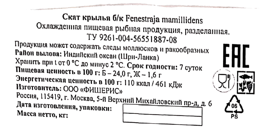 Крылья ската – вкусный и полезный морской деликатес, который высоко ценится в кулинарии. Мясо белое, нежное и сочное, оно очень быстро готовится и сохраняет мягкость после термической обработки. Не содержат костей, а состоят из небольшого количества мягких хрящиков. Крылья ската могут иметь аммиачный запах. Дело в том, что мясо этой рыбы может содержать в себе до 2% мочевины. Чтобы избавиться от посторонних запахов необходимо замочить крылья в воде на 2-3 часа.